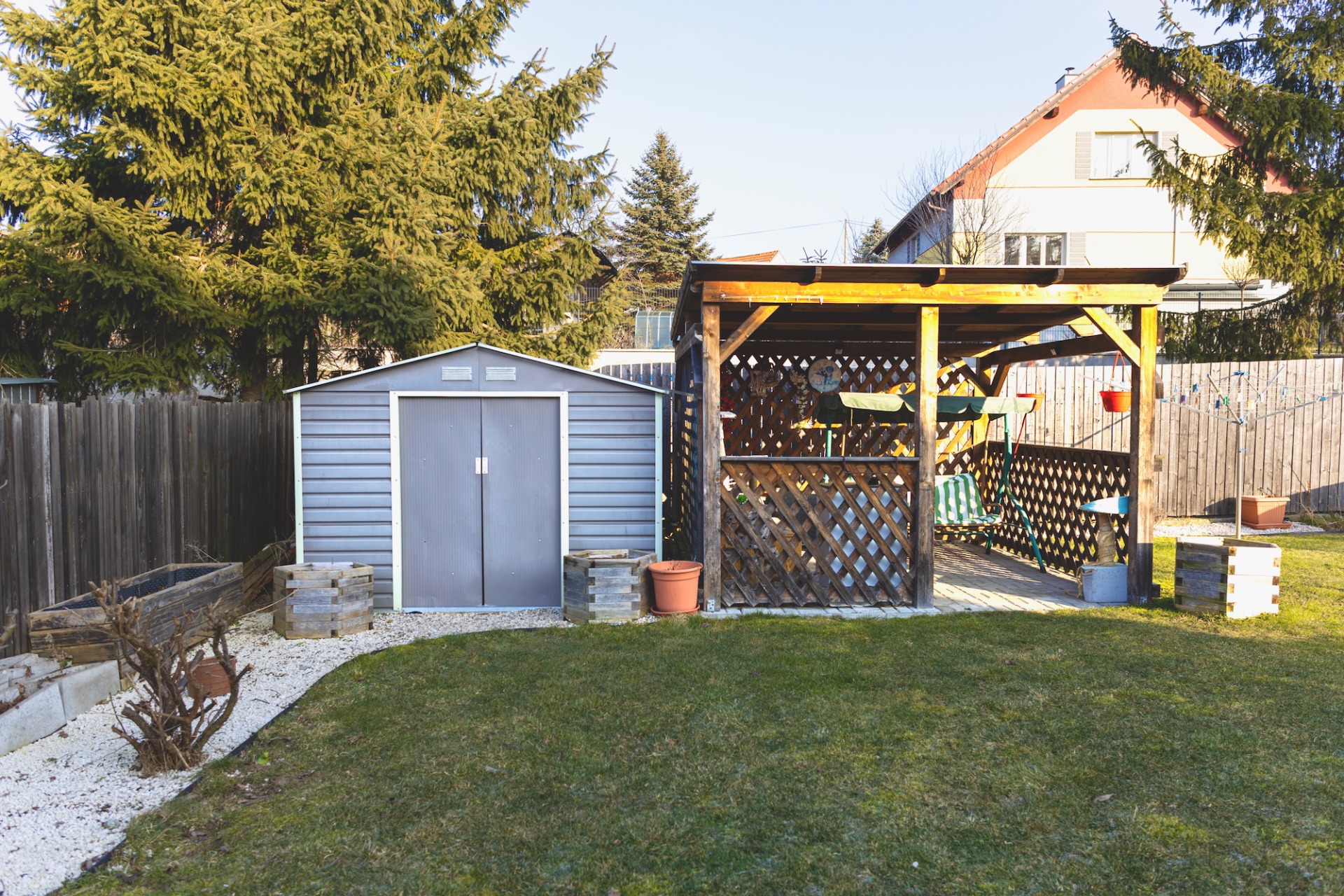 Na obývací pokoj spodního bytu navazuje rozlehlá terasa, ze které máte možnost vstupu na zahradu. Na té najdete jak místo pro velký bazén, tak altánek pro odpolední posezení nebo menší zahradní domeček na zahradní vybavení. Na pozemku najdete i kopanou studnu, která má zhruba 6m a která zásobuje celý dům i zahradu